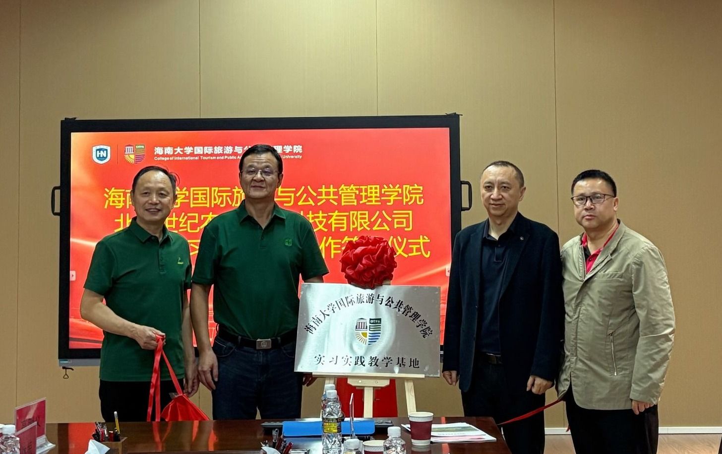 2025年12月4日,海南大学国际旅游与公共管理学院与北京世纪农丰土地科技有限公司在观澜湖校区2-4105会议室举行了产学研实习实践基地合作签约仪式。世纪中农研究院院长黄元仿、副教授王健、汤怀志,北京世纪农丰土地科技有限公司副总经理张体振、海南分公司总经理王会明、副总工高明义,学院党委书记郭强、副院长何彪、党委副书记欧少红、副院长黄朝明、土地资源管理系教师代表等出席签约仪式。副院长黄朝明教授主持签约仪式。