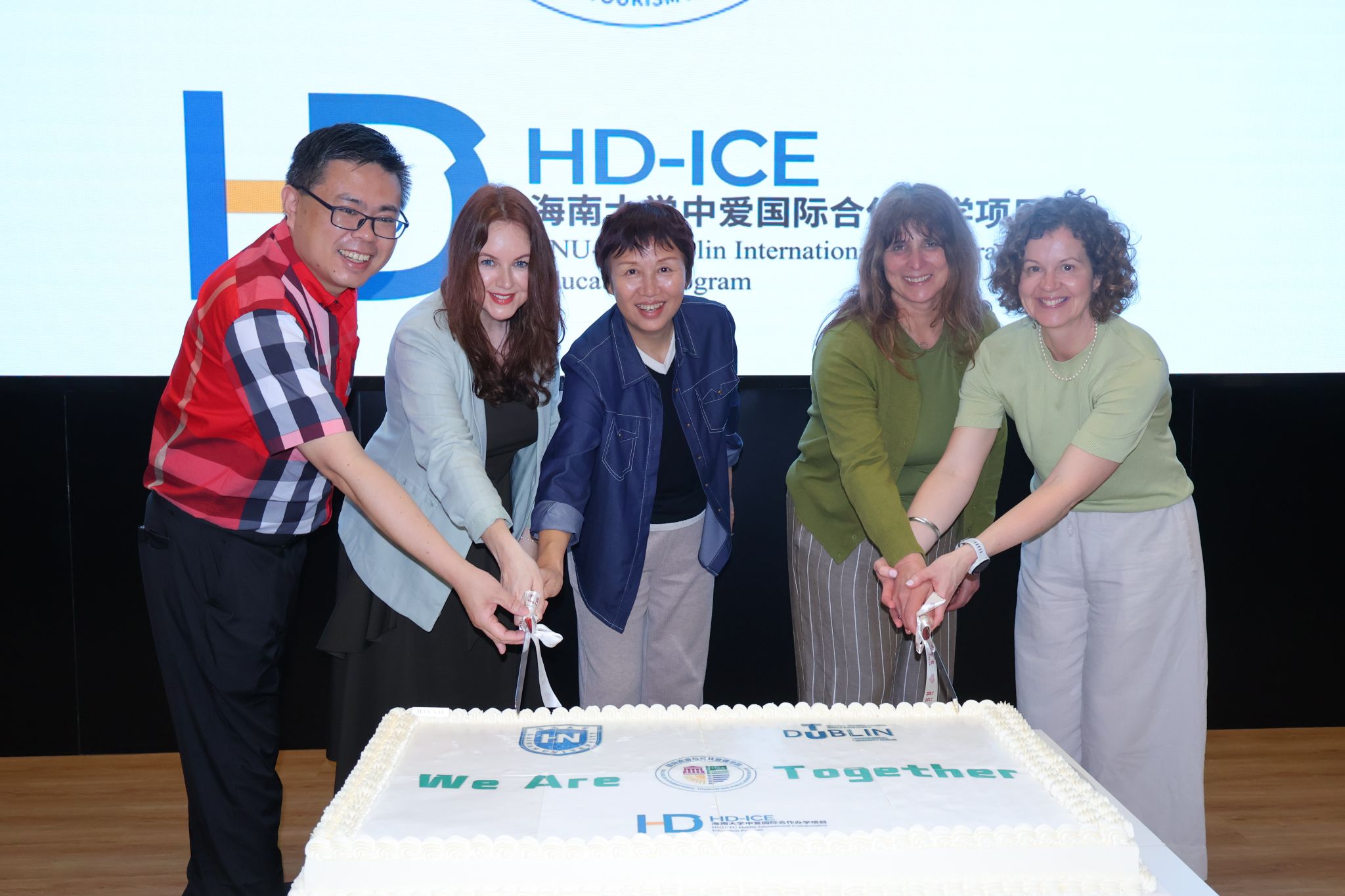 海南大学国际旅游与公共管理学院院长王琳、会展经济与管理(中外合作办学)专业责任教授耿松涛、爱尔兰都柏林理工大学Emma O'Brien博士、Ziene Mottiar博士及Aíne Conaghan博士共同出席活动。各方表示,希望通过联合举办庆祝活动,深化国际教育交流,搭建跨文化沟通桥梁,增进两校深厚友谊。活动现场举行切蛋糕仪式,正式发布中爱国际合作办学项目全新标识。